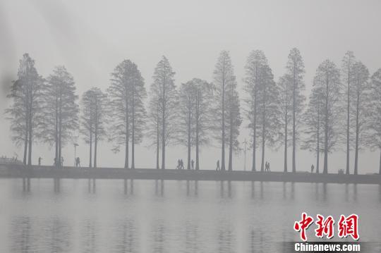 武漢東湖邊,樹木籠罩在霧霾中。張暢 攝