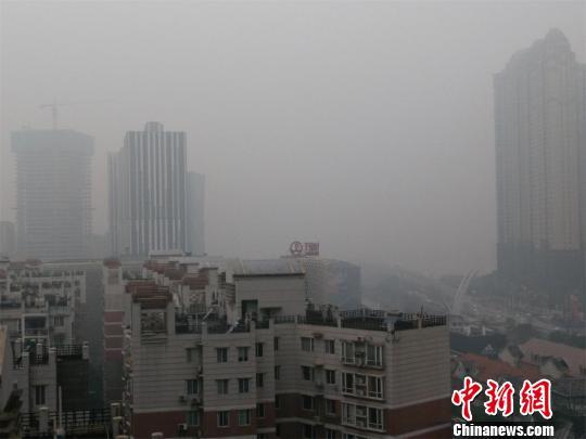 武漢建筑物籠罩在霧霾中,模糊不清。張暢 攝