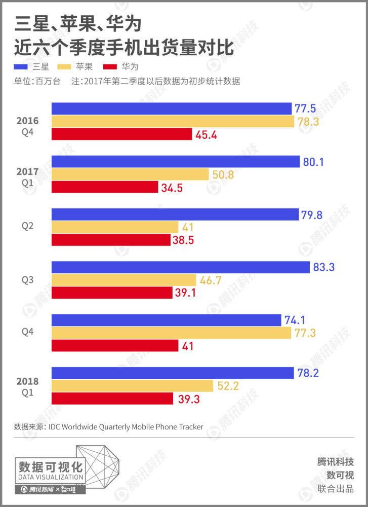 根據(jù)國際數(shù)據(jù)公司(IDC)報(bào)告,2017年全球手機(jī)出貨量由三星的3.17億臺(tái)坐穩(wěn)第一名寶座,蘋果則以2.15億臺(tái)位居第二,華為以1.53億臺(tái)位居第三。