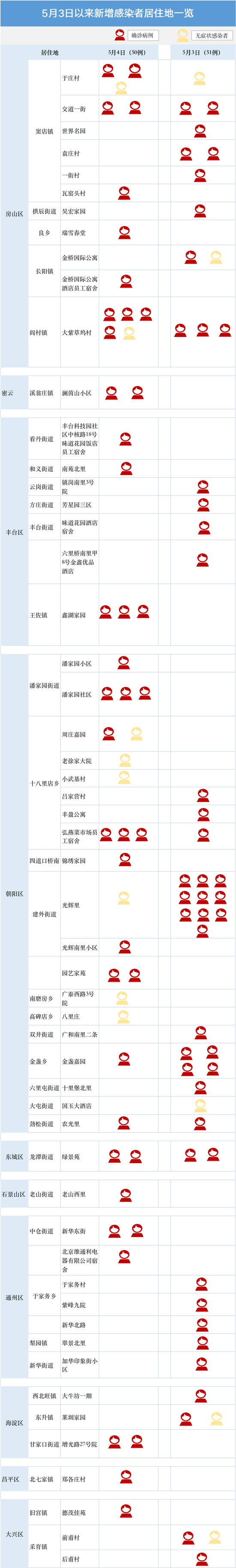 4月22日至5月5日15時,北京累計報告544例感染者,涉及15個區(qū)域:朝陽220例,房山135例,通州58例,豐臺41例,海淀23例,順義22例,石景山13例,昌平10例,大興9例,東城5例,西城、密云和延慶各2例,門頭溝和經(jīng)開區(qū)各1例。