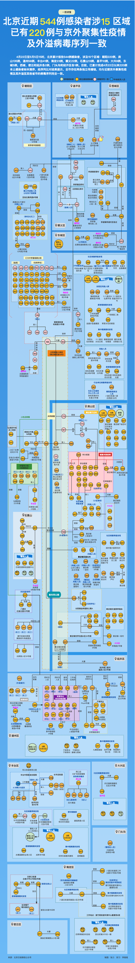 值得注意的是,近期544例感染者中,220例已確定有一個“共同點”——目前,已累計完成4月22日以來220例本土感染者標本測序,經(jīng)序列比對結果提示,全市存在兩條獨立傳播鏈,均與近期京外聚集性疫情及其外溢至其他省市的病毒序列完全一致。