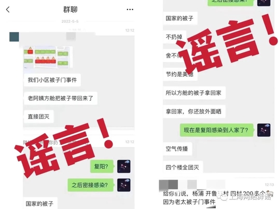 昨日,上海辟謠平臺收到不少網(wǎng)友留言,稱有多則聊天記錄提到“一個(gè)老太方艙回來偷偷把那邊被子帶回來……然后陽臺曬”,導(dǎo)致數(shù)層樓全陽。相似傳言在多個(gè)區(qū)傳播。